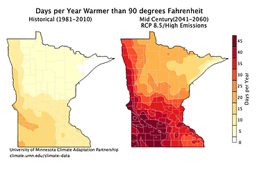 Although these types of natural disasters have rarely effected MN, our weather patterns and climate trends have changed over the last 100 years and will continue to change and evolve over the next century. One of the things that makes it difficult for Minnesotans to recognize a changing climate is that our own climate is highly variable. We are all used to temperatures above 100 degrees in the peak of summer and temperatures that fall far below 0 in the winters. This makes it difficult to discern if one year is hotter, colder, wetter, or dryer than years past. However, thanks to extensive climate pattern tracking in the State of MN going back to late 19th century, we are able to reflect on historical weather patterns and pick out a few clear trends. The biggest of these trends is that the state is, on average, getting warmer and wetter.