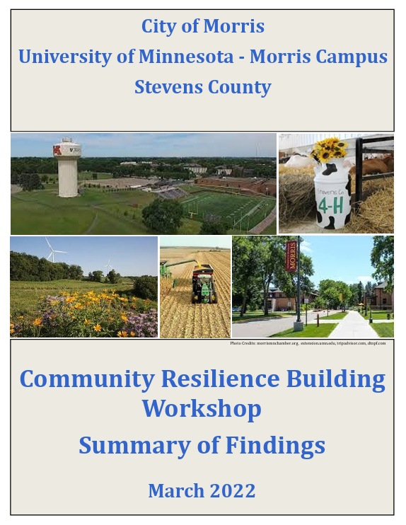 The Morris Model Community Resilience Plan (PDF) was put together in 2016 by grant supported student interns Sophie Bishop and Kyle Klausing. The report summarizes several resilience challenges facing our community; actions we have taken to prepare for these challenges; and shared goals we have to make our community more resilient in the future.